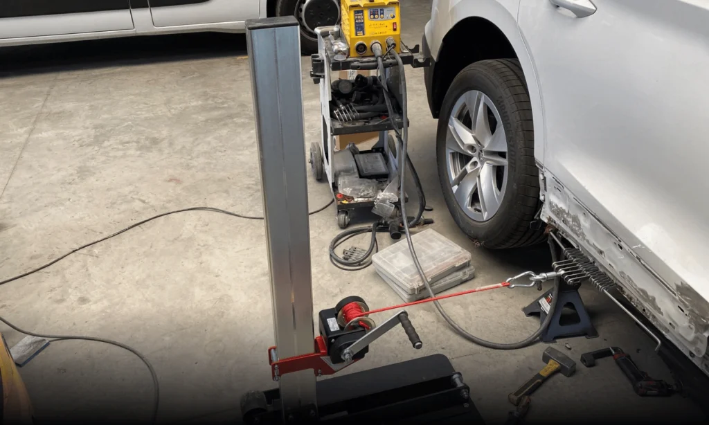Le bas de caisse a été redressé avec précision grâce à un vérinage réalisé à l’aide d’une équerre de traction.