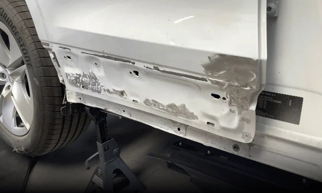 Les deux portes droites étaient fortement endommagées, et le bas de caisse avait subi un choc important.